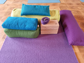 Durch das unterstützende Positionieren von Yogahilfsmitteln wie Kissen, Decken, Bolstern wird der Körper stabilisiert und gut gebettet, so kann dann für einige Minuten still und bewegungslos verweilt werden, innere Strukturen (Fasziengewebe, Muskeln,) lassen mehr und mehr los.